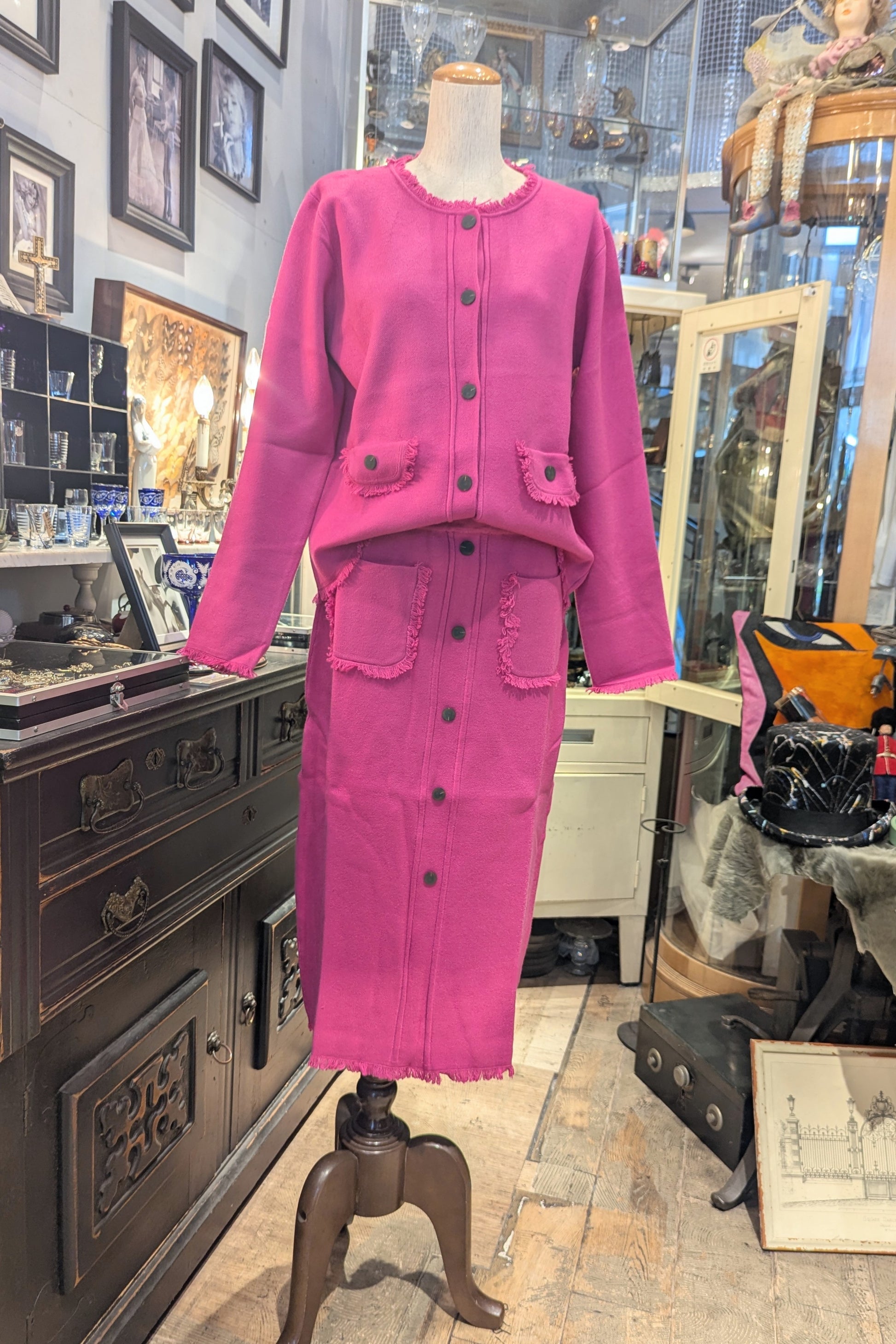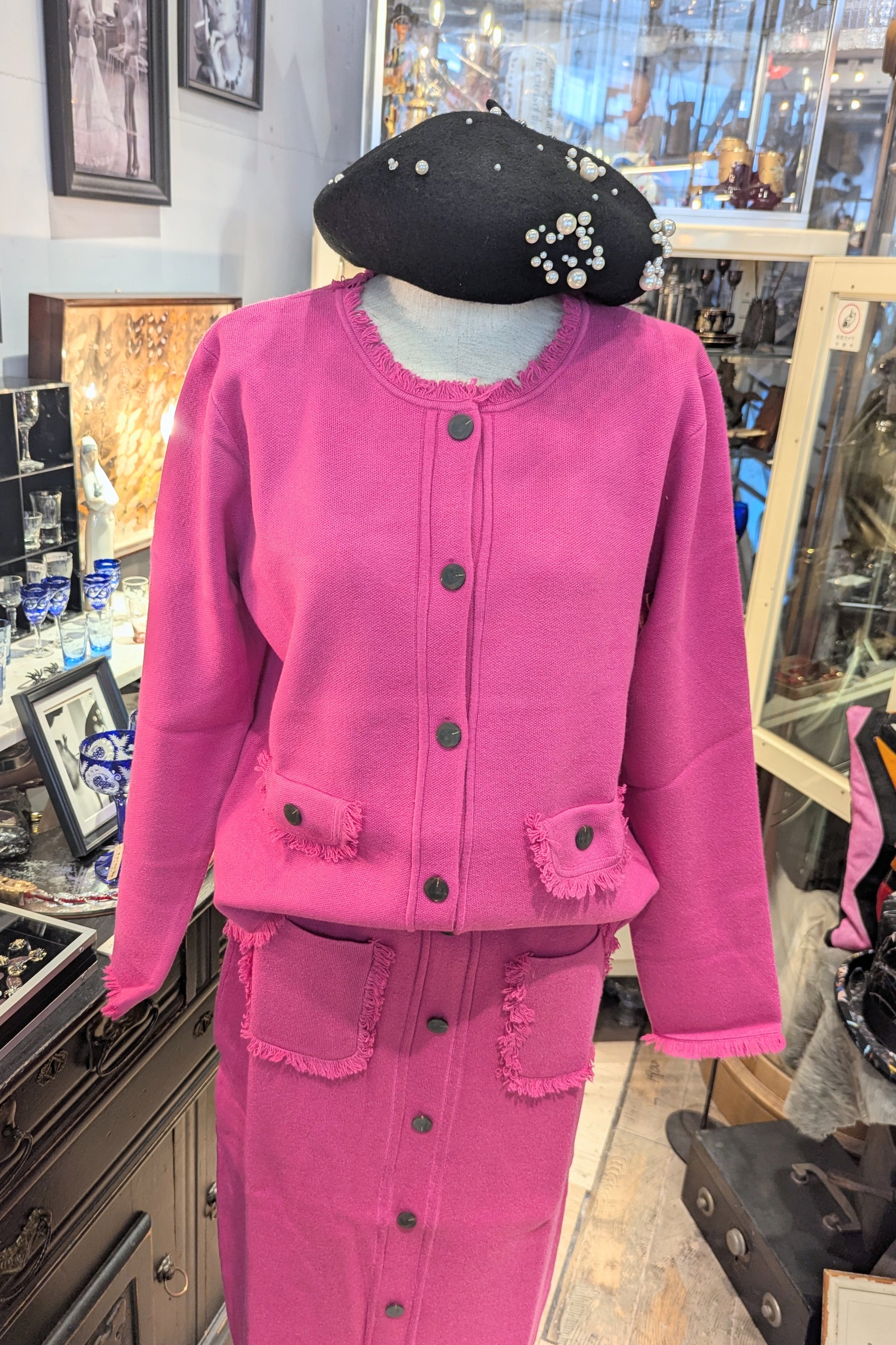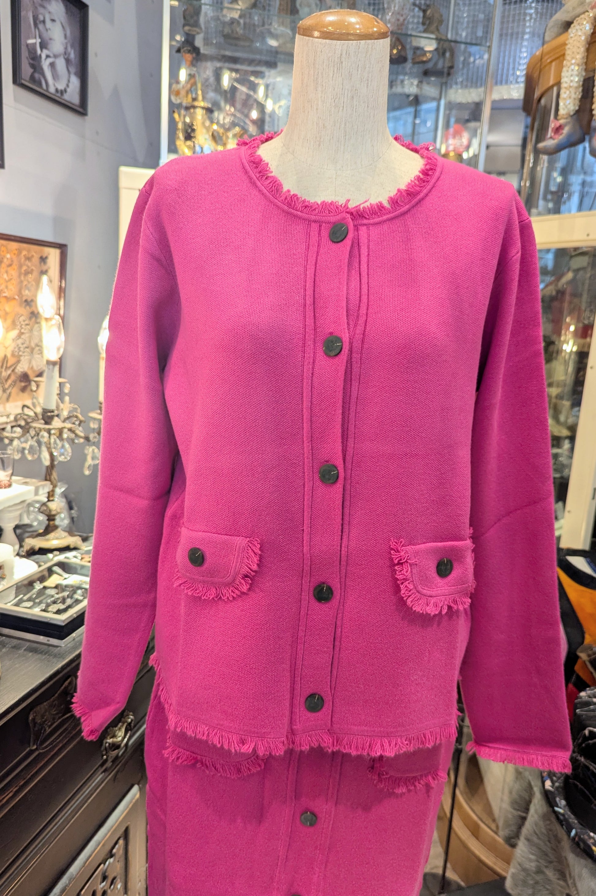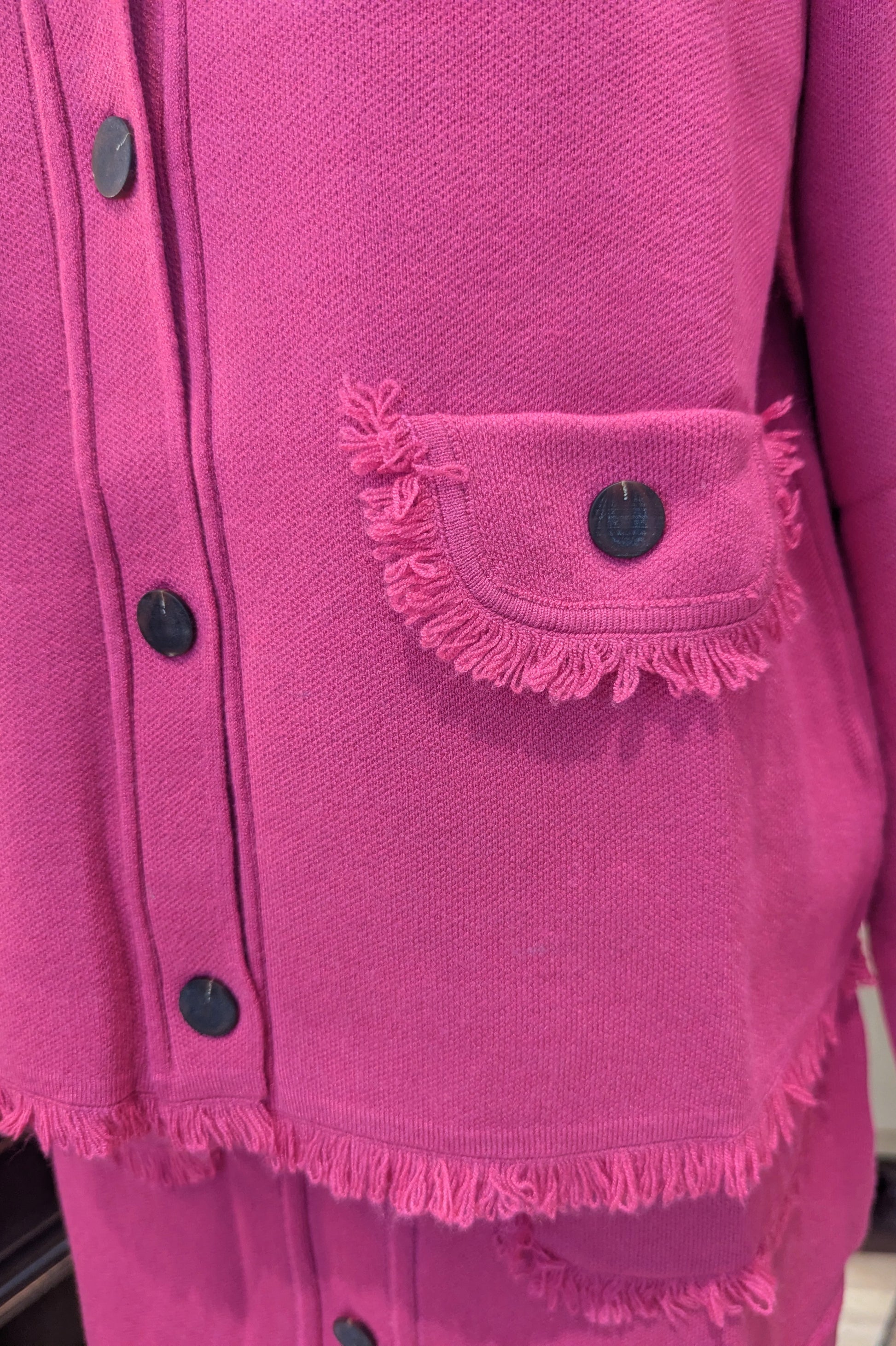 裾のフリンジが効いた、とても綺麗なピンクのカーディガンジャケット。