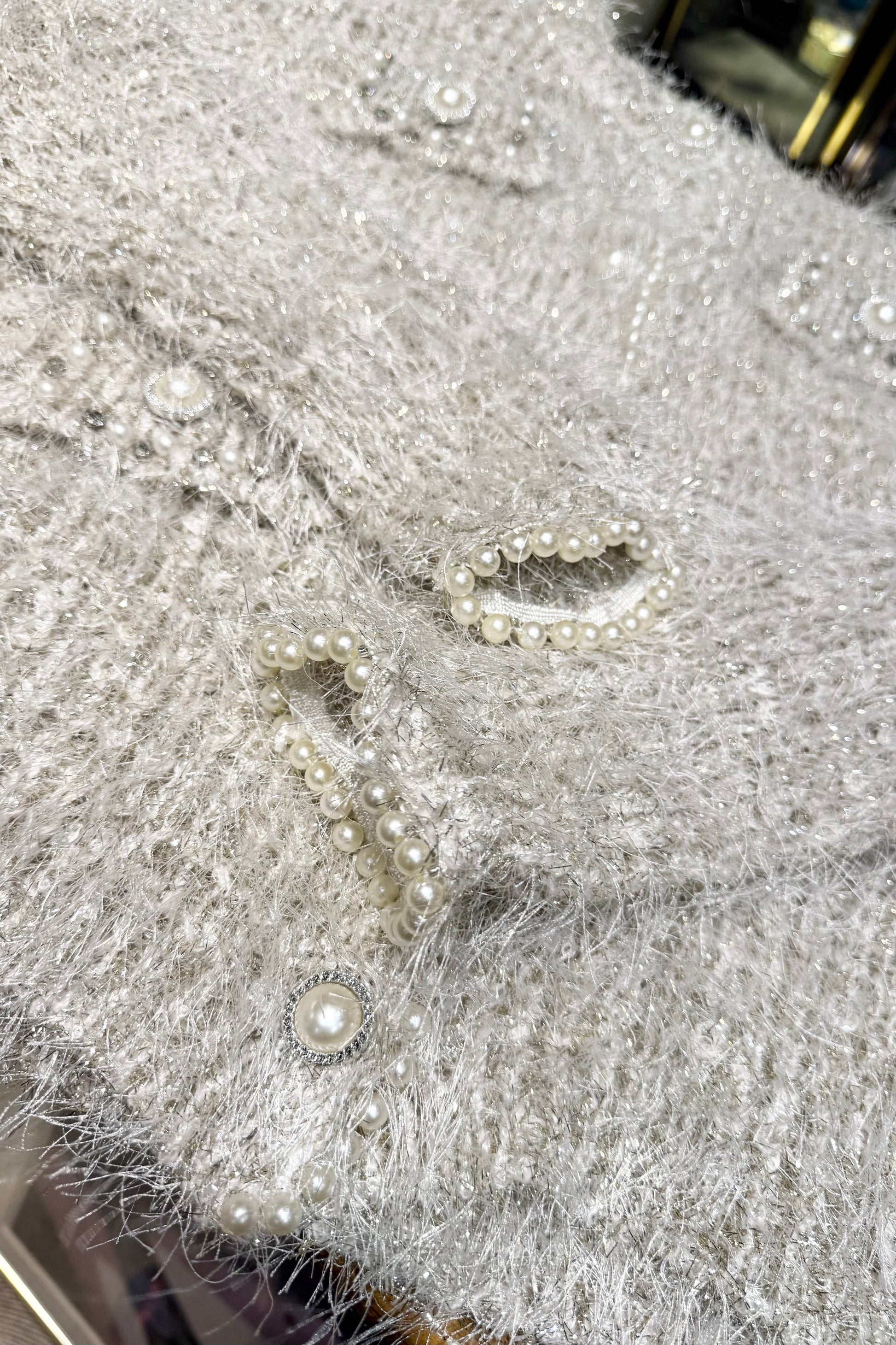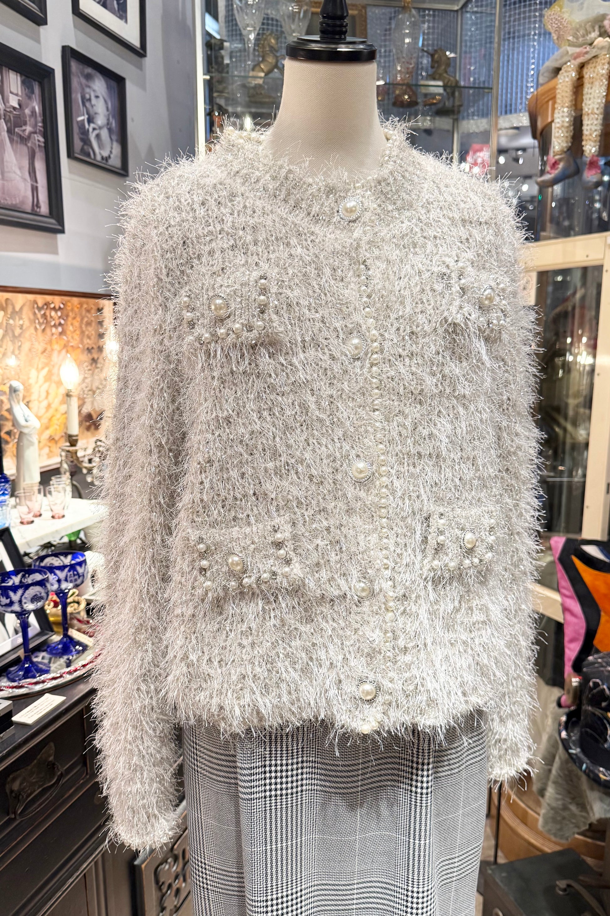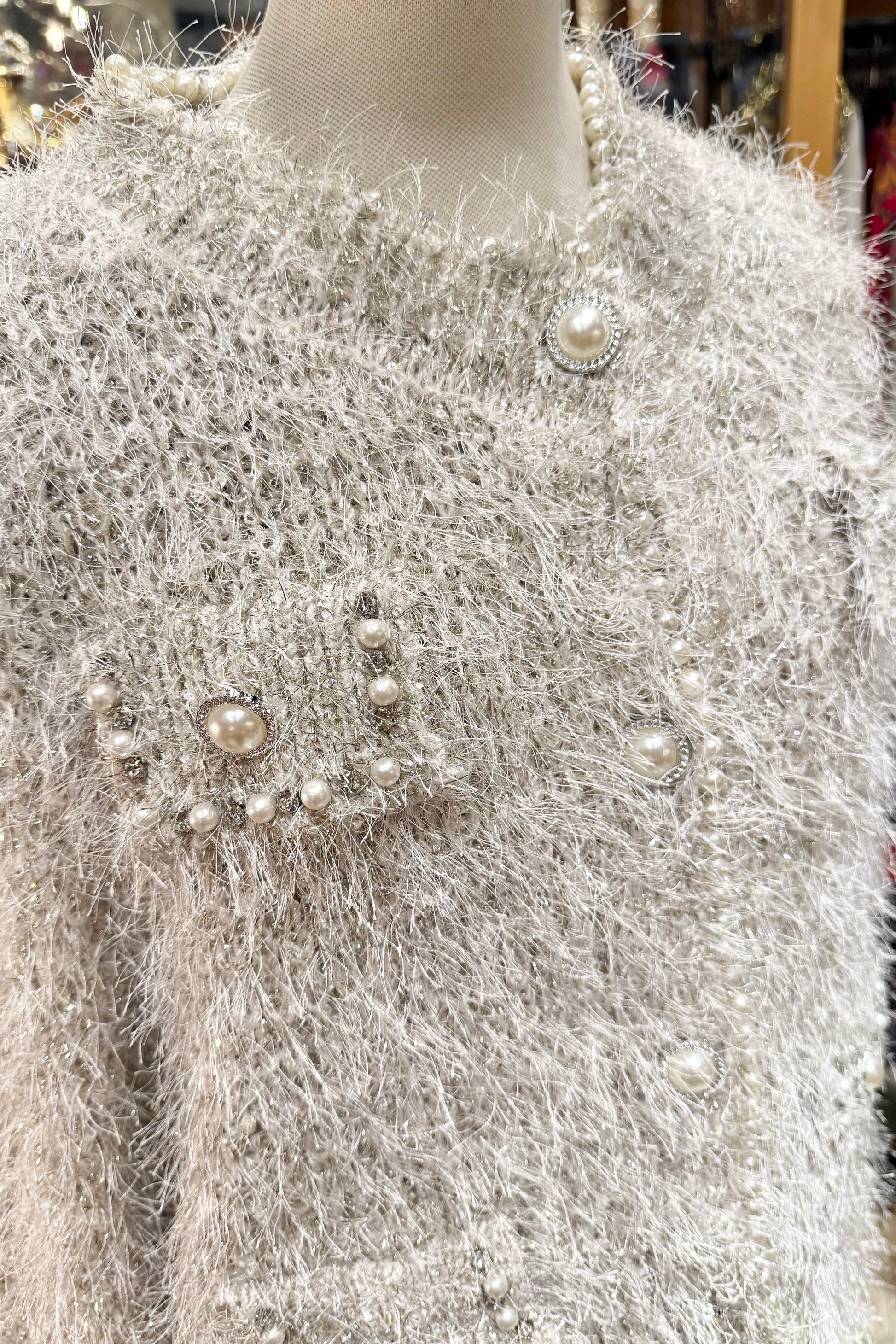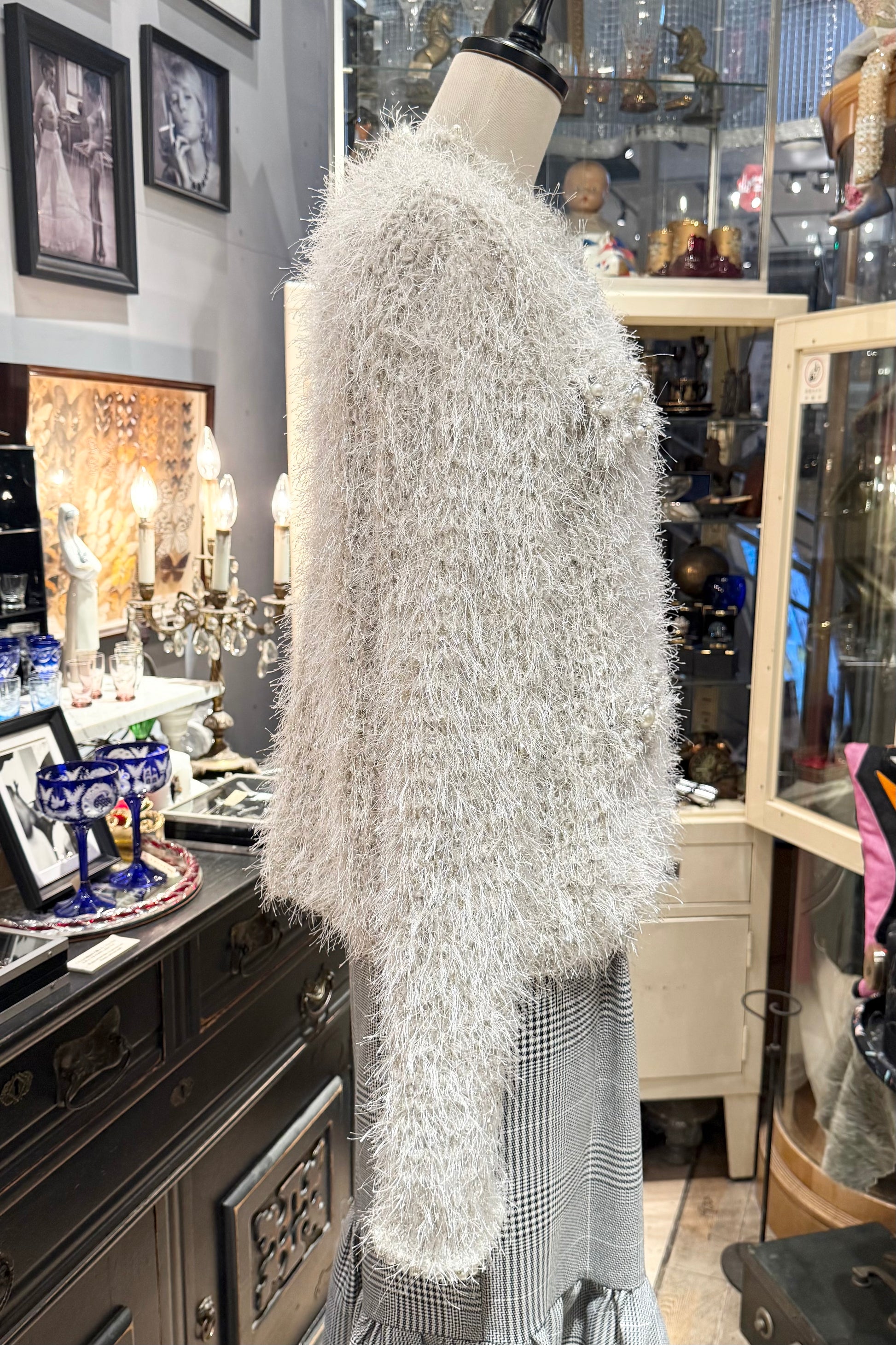 パールやビジューを贅沢にあしらった、なんとも華やかなカーディガン。