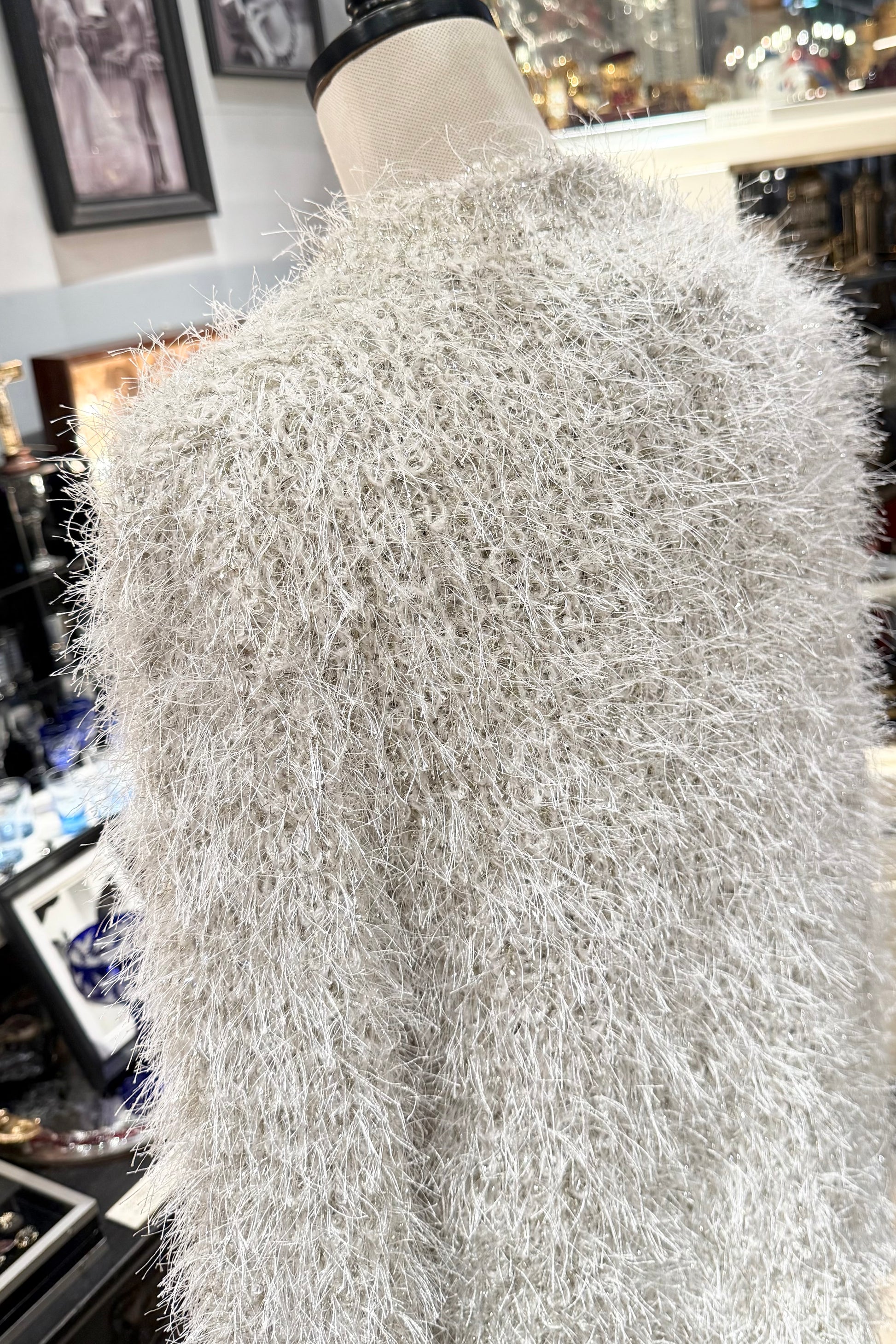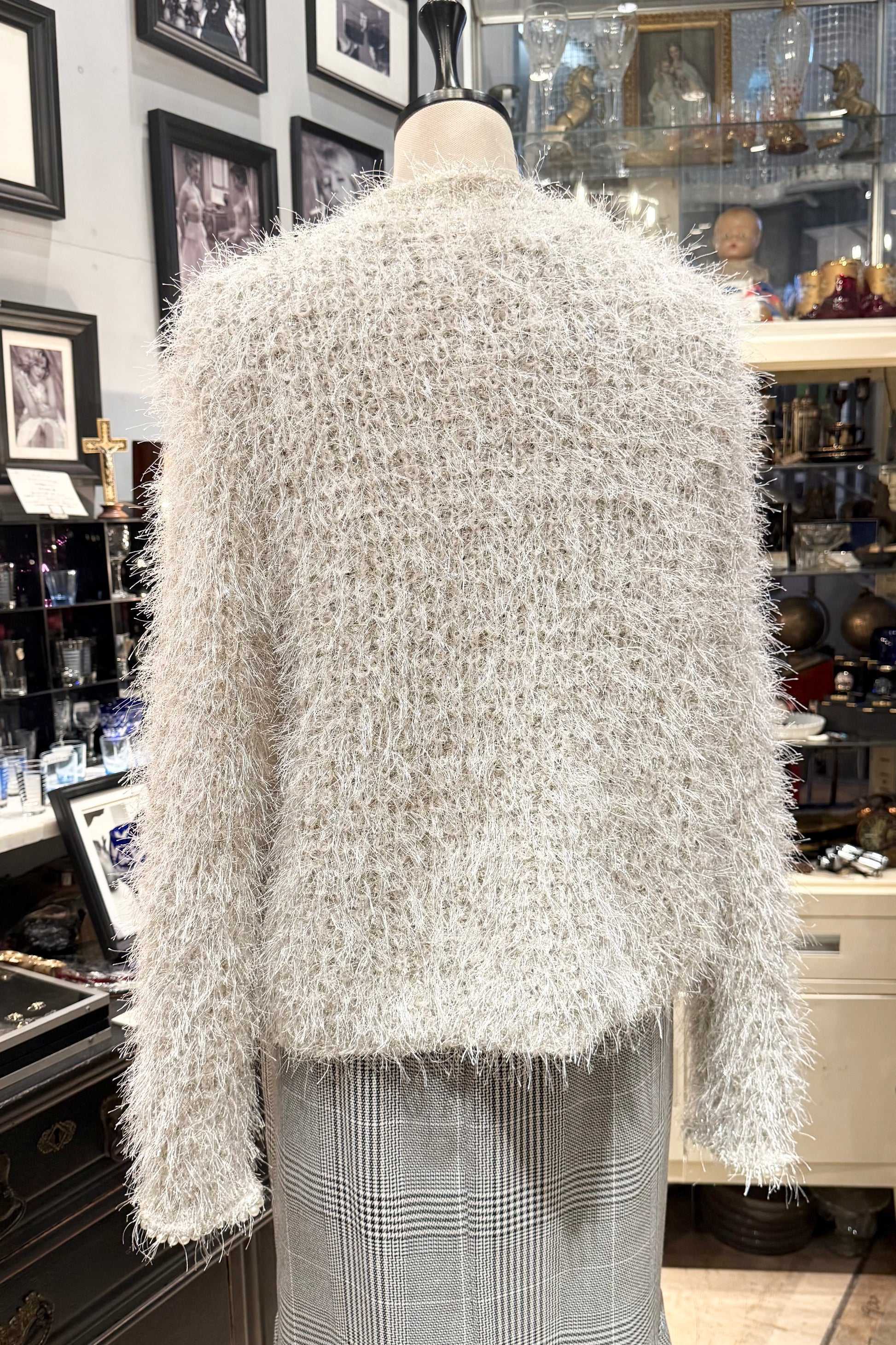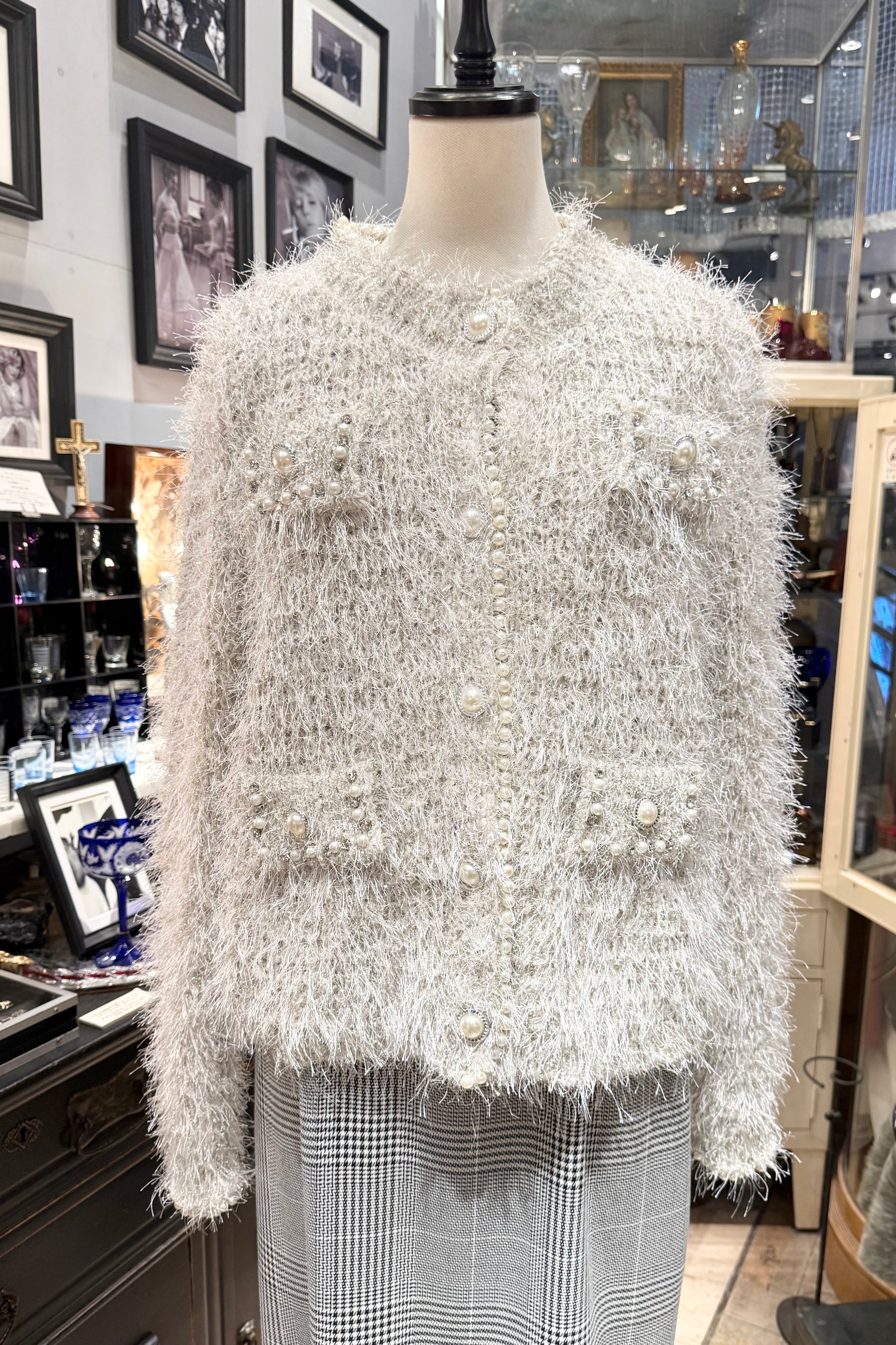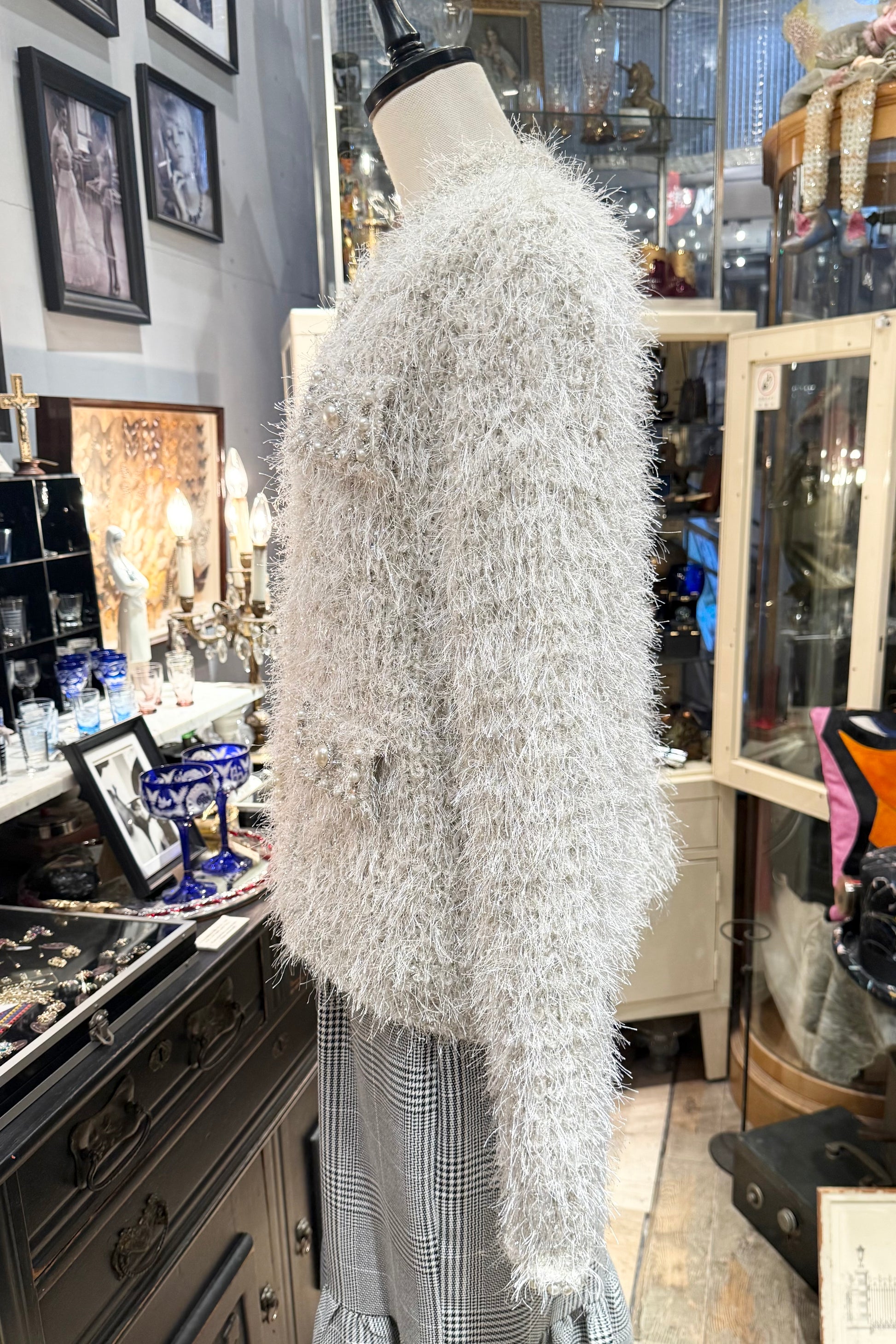 パールやビジューを贅沢にあしらった、なんとも華やかなカーディガン。