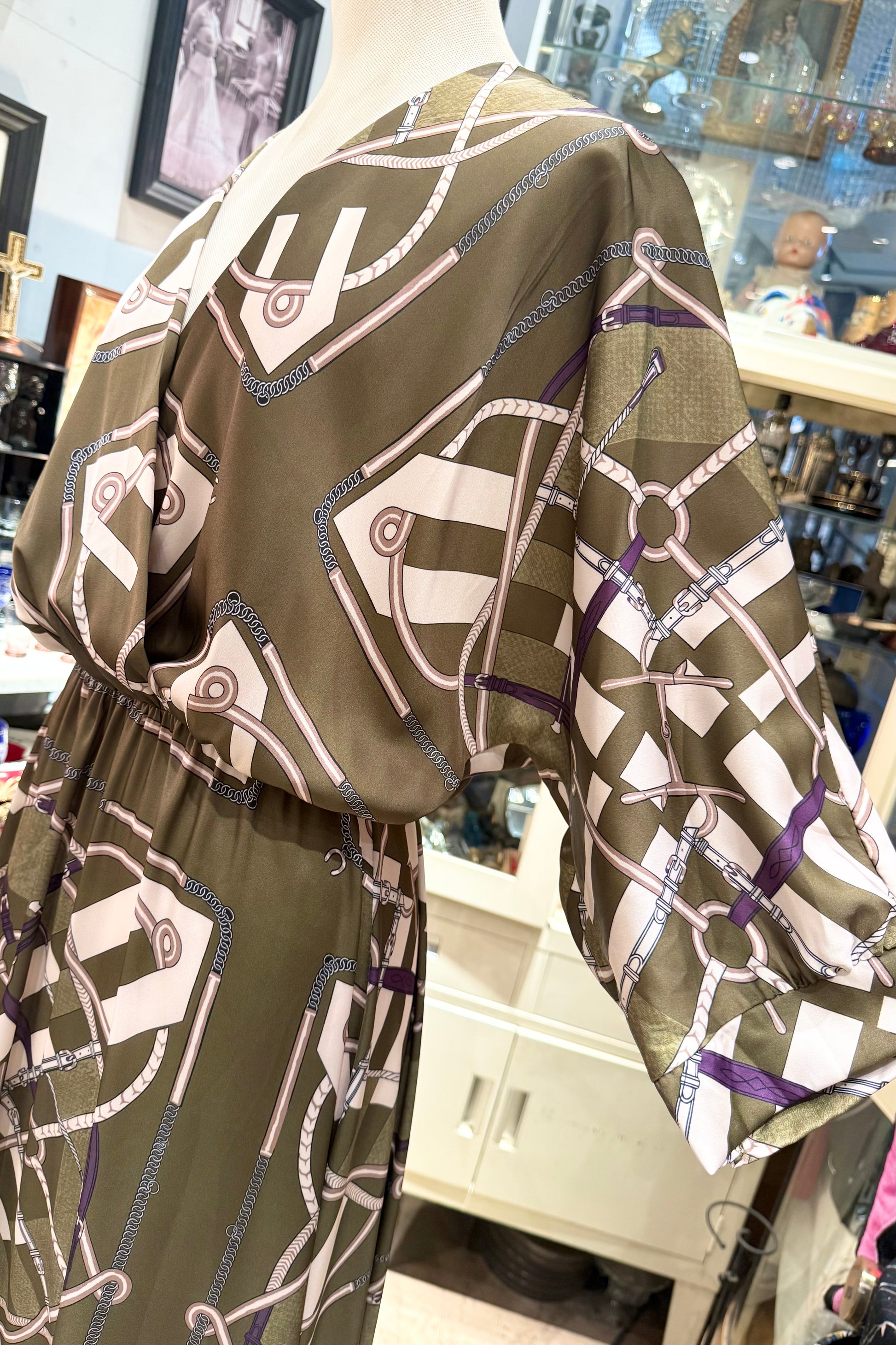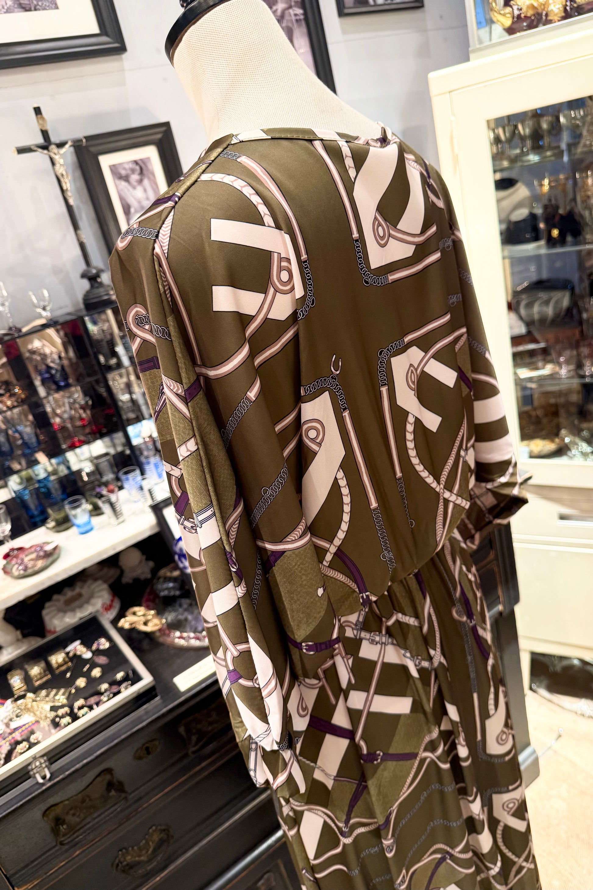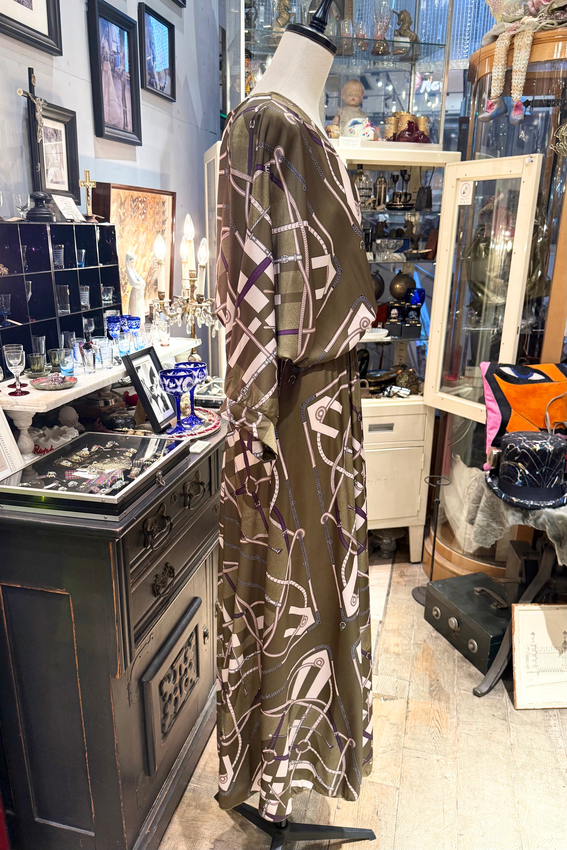 こちらは華やかなスカーフ柄にシックなカーキカラーが大人の魅力を引き出します。