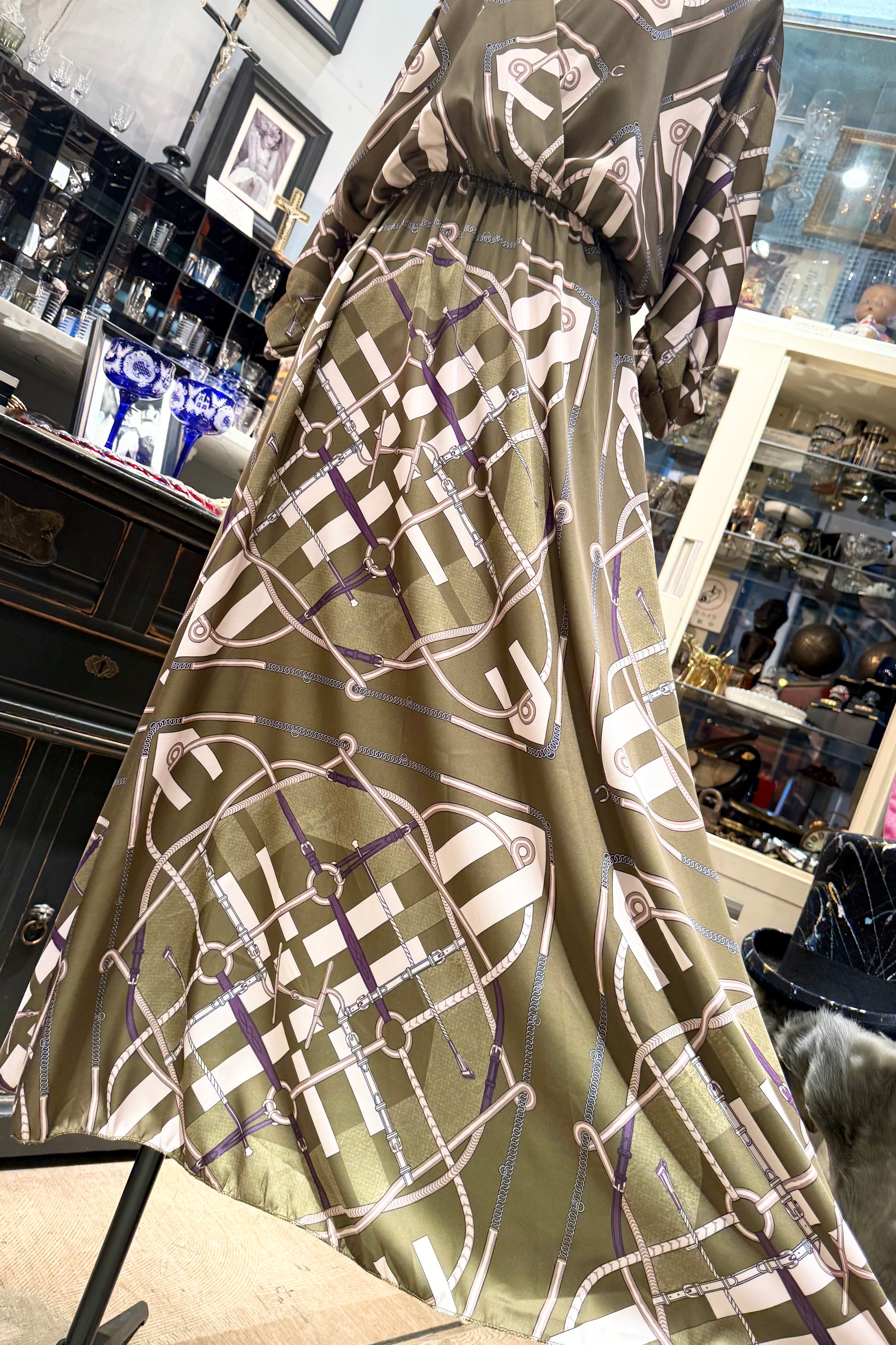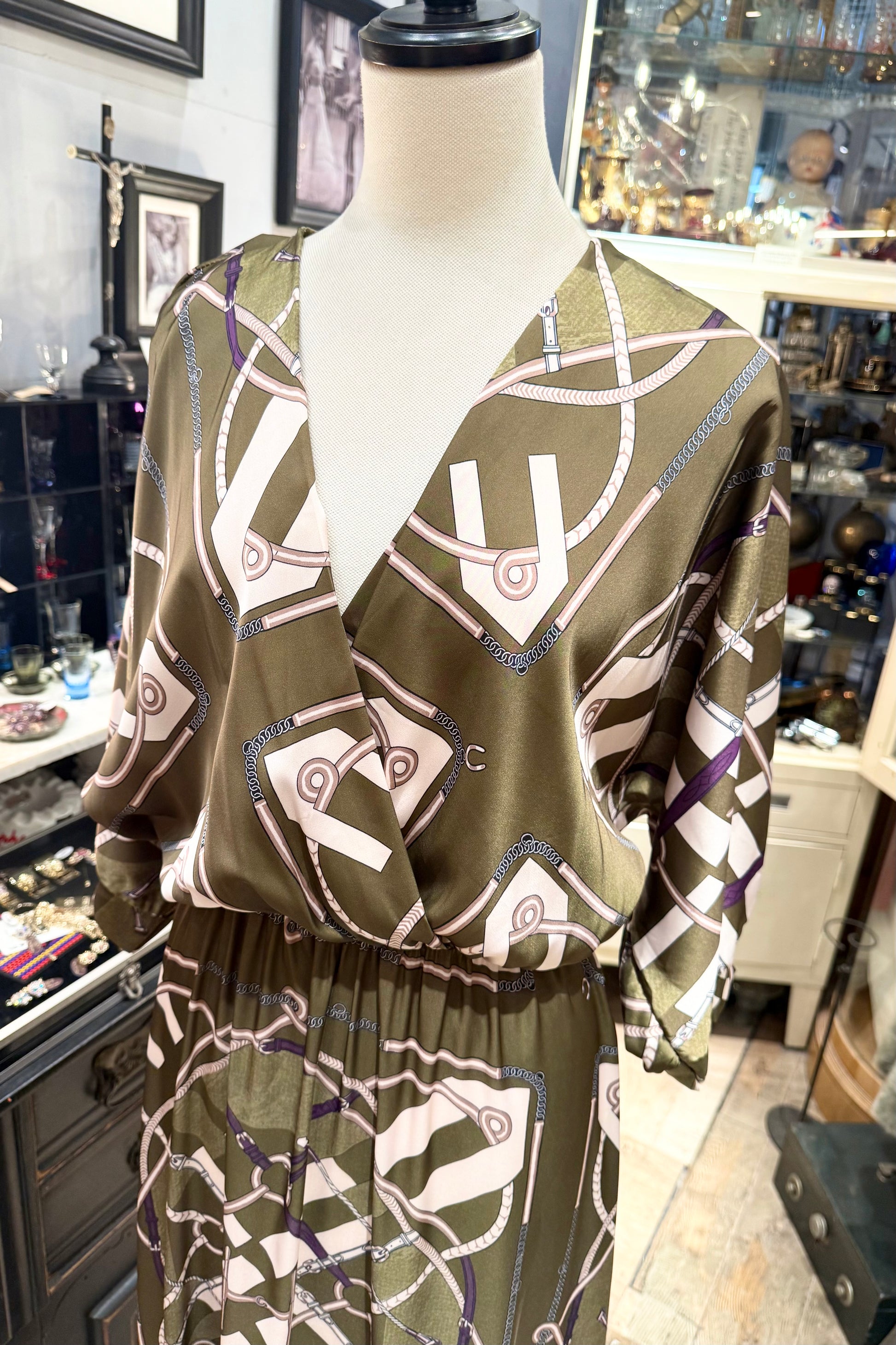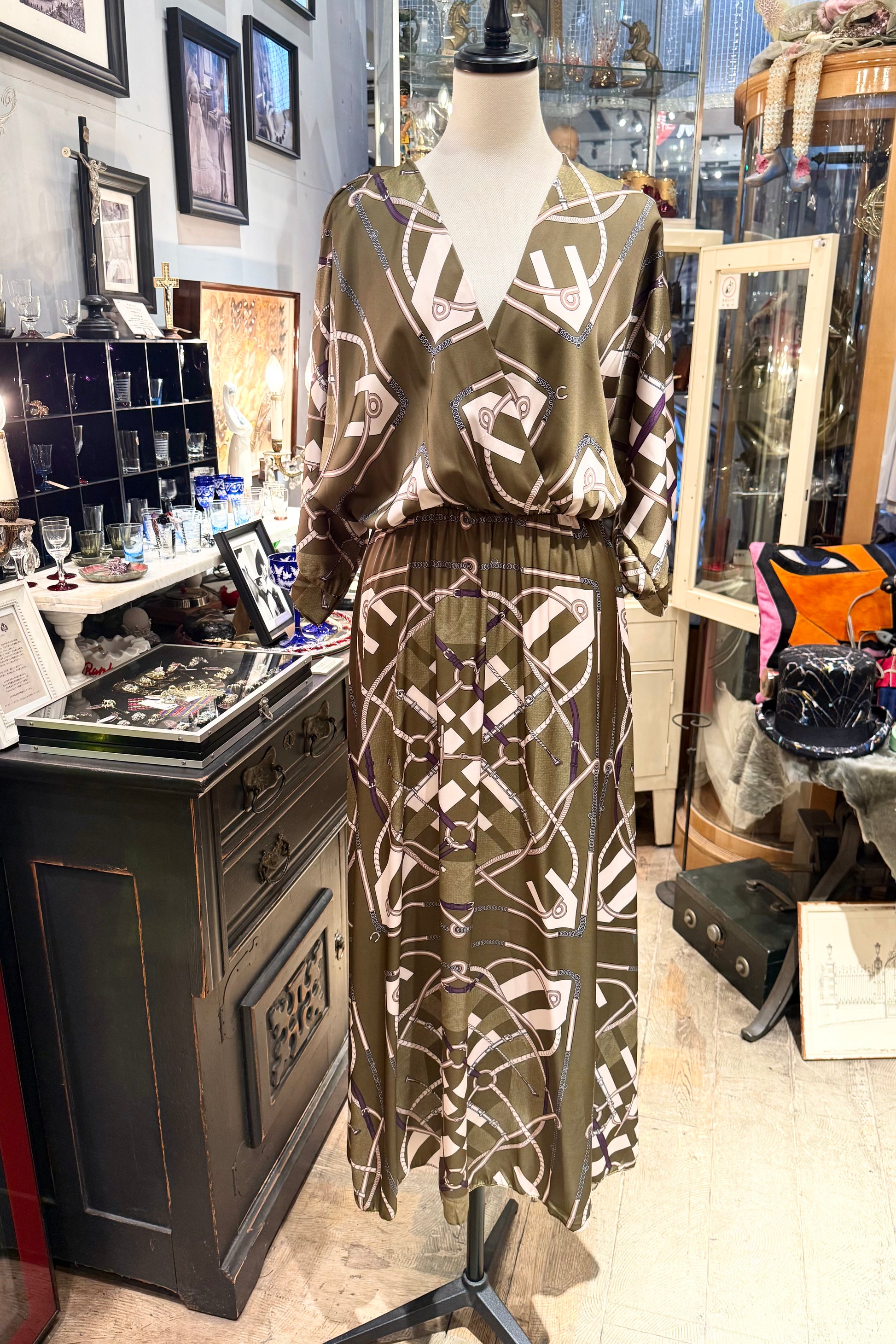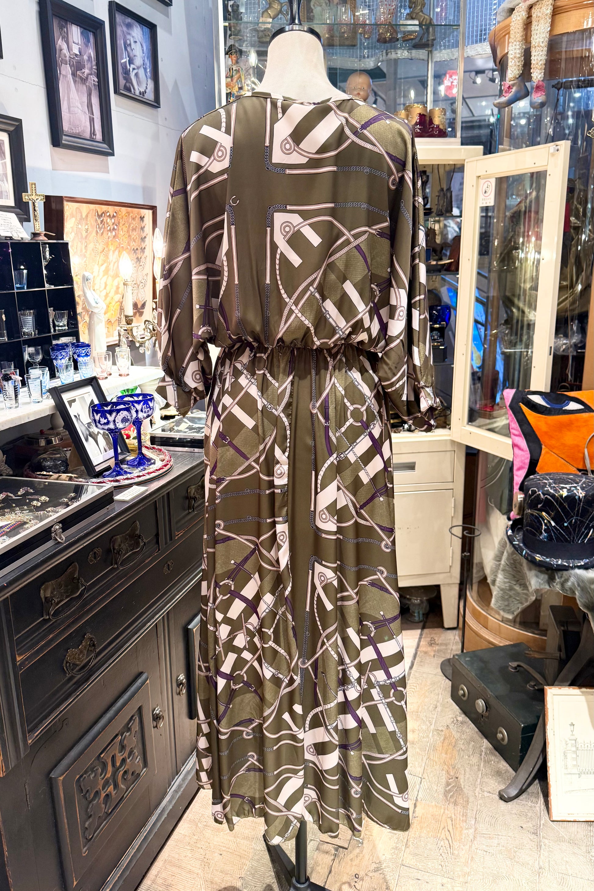 こちらは華やかなスカーフ柄にシックなカーキカラーが大人の魅力を引き出します。