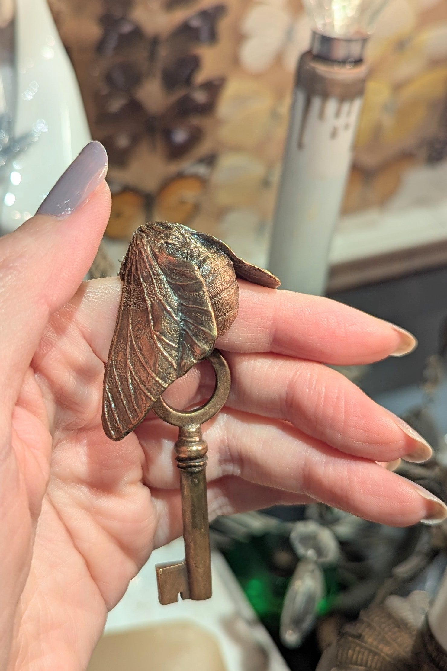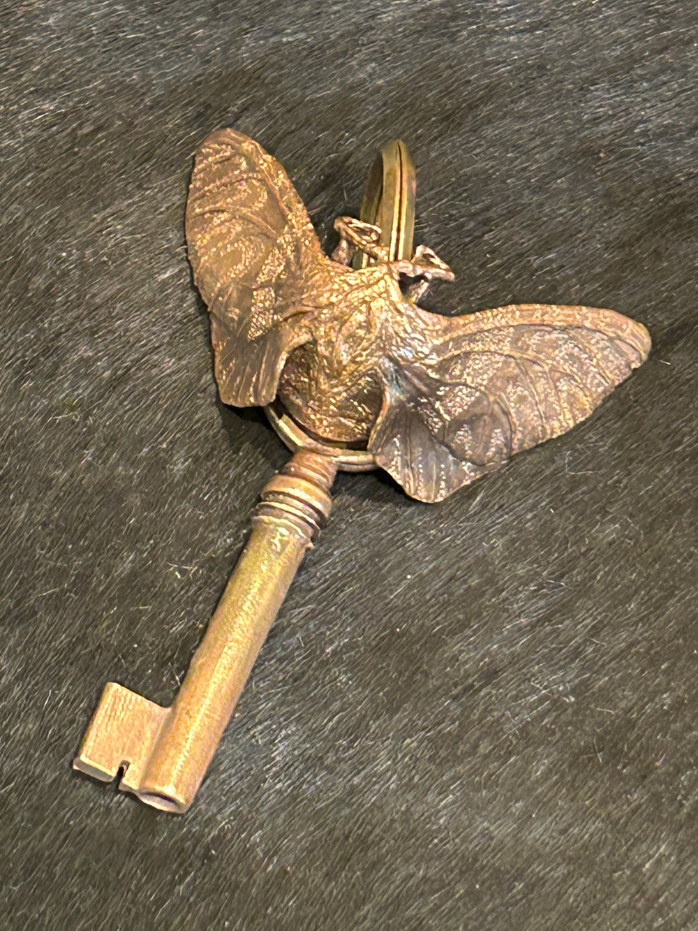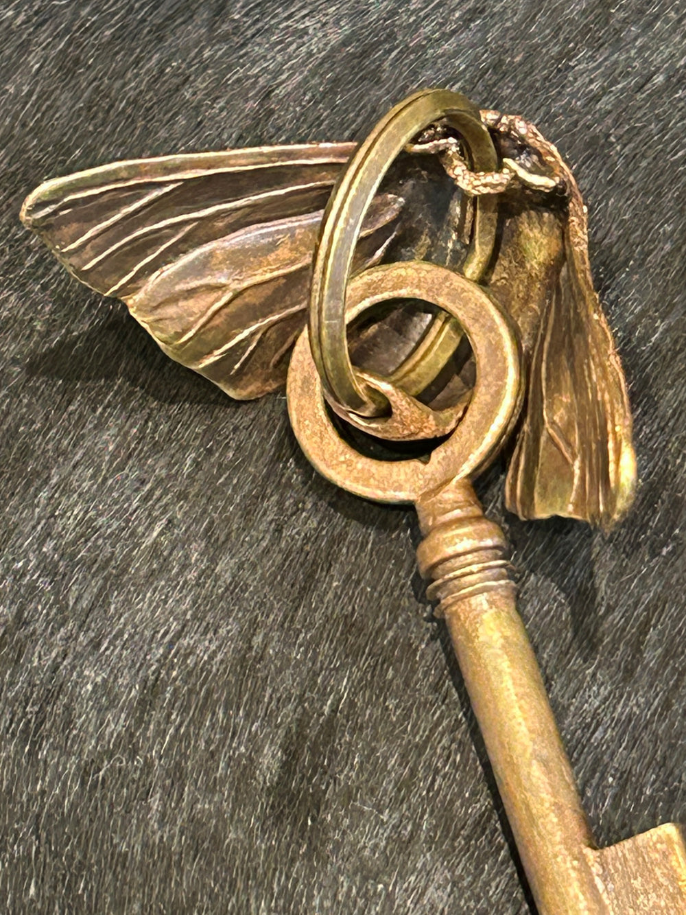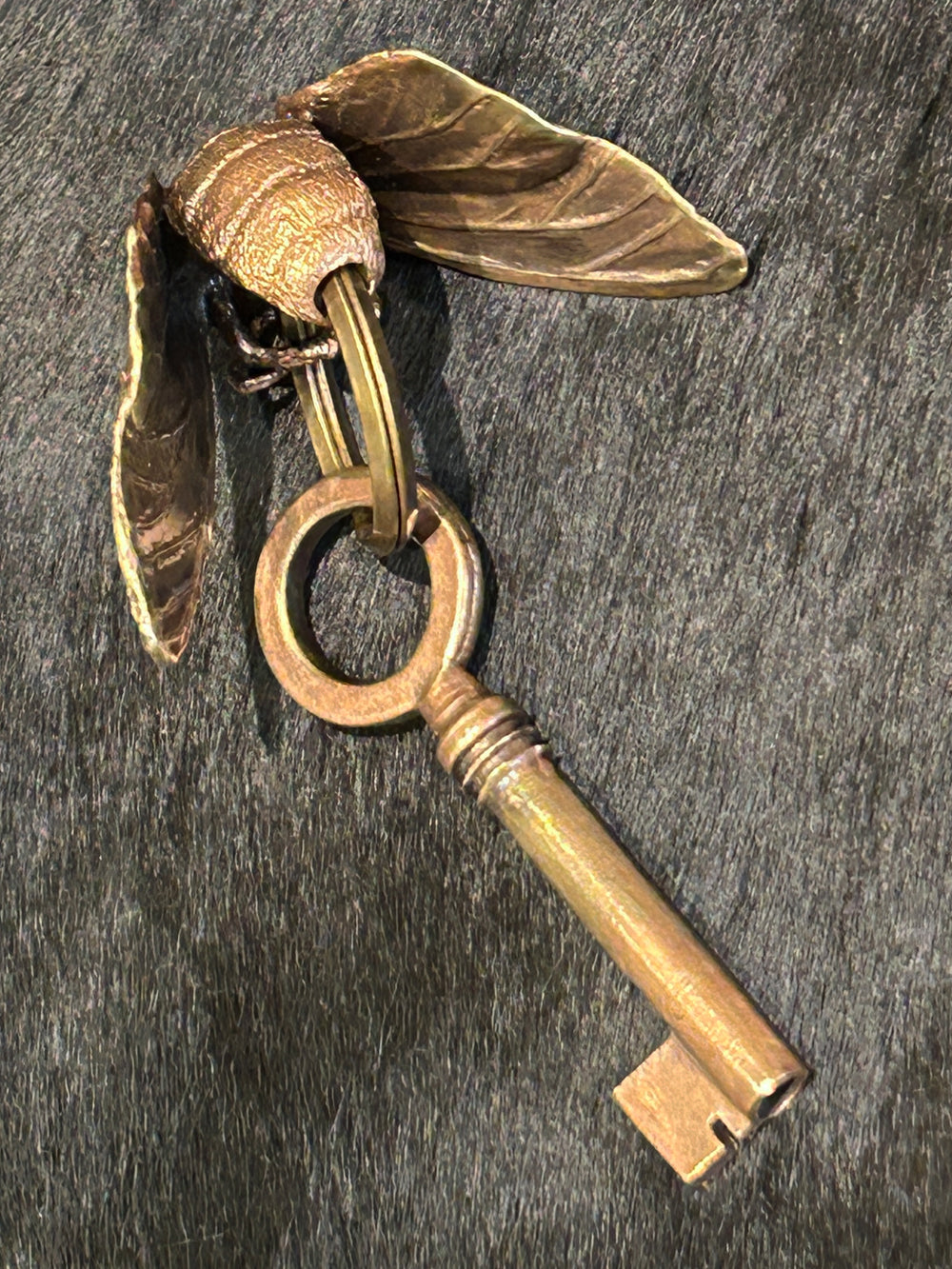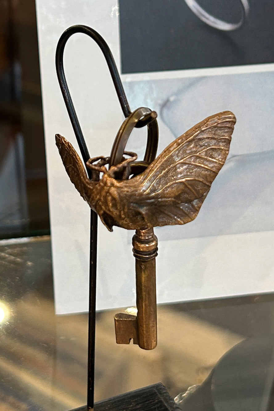 リアルな昆虫と謎めいた鍵のモチーフが付いており、キーリングとしてはもちろん、バッグチャームとしても存在感のある一点。
